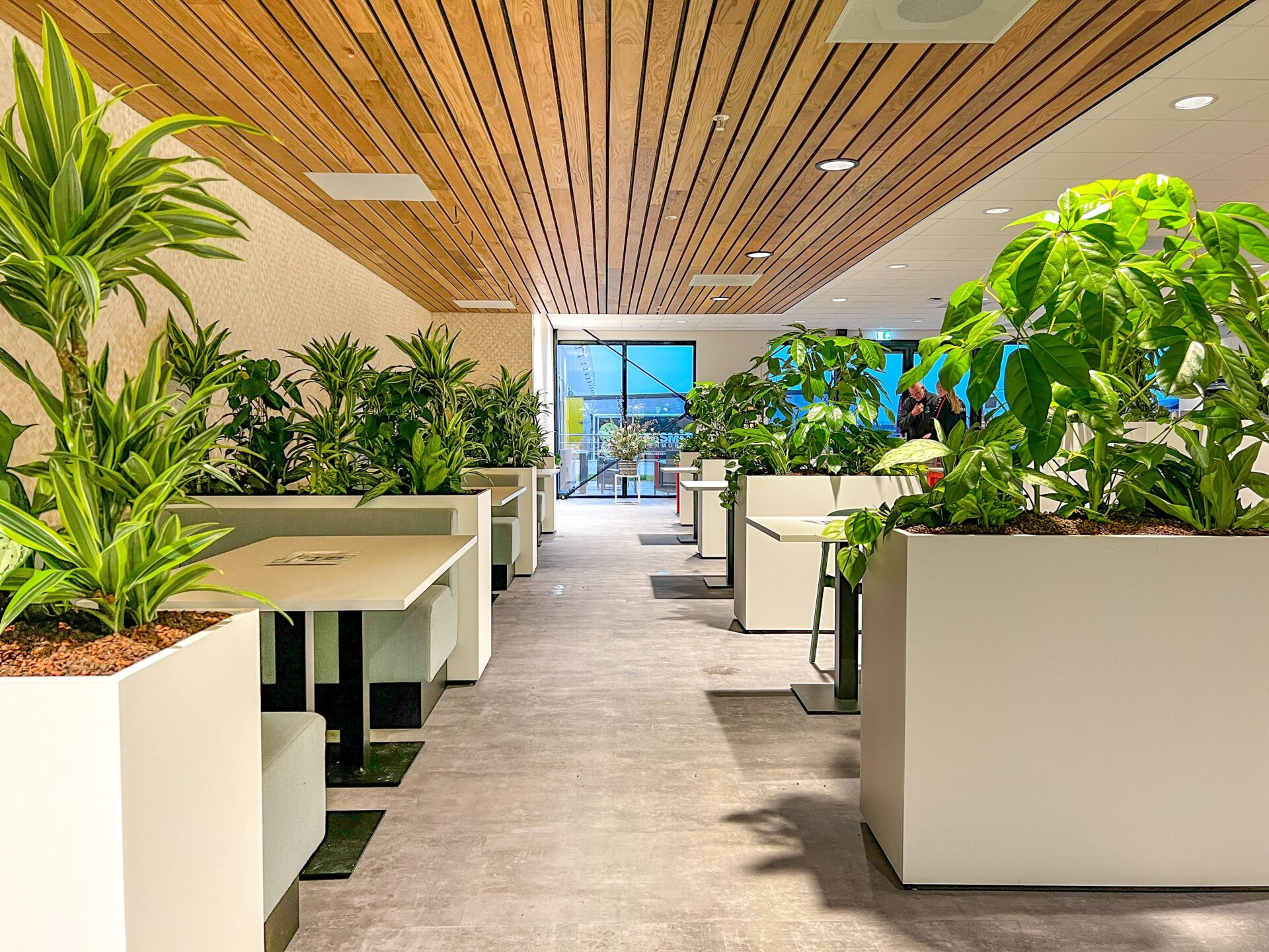 - Ingebouwde plantenbakken: verwerkt in meubels zoals vergadertafels, kasten, balies of bureaus.