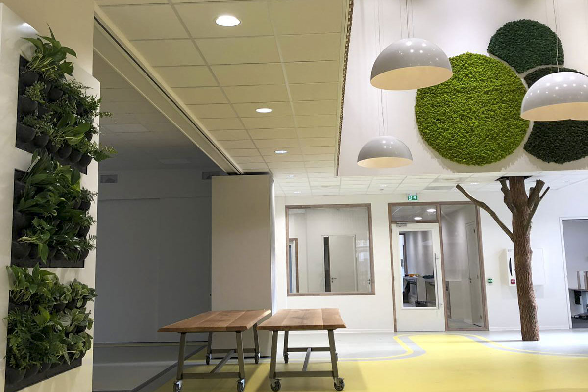 Voor een basisschool in Vroomhoop hebben we een leuke mosboom gemaakt met daaronder een echte houten boomstam. De mosboom staat/hangt in de centrale ruimte in het gebouw en is een echte eyecatcher. Daarnaast zijn er op verschillende plekken in het pand plantenwanden opgehangen van het systeem LivePicture. In dit biophilic gedesignde pand zijn de groen- en houttinten een prachtig kleurenspel.