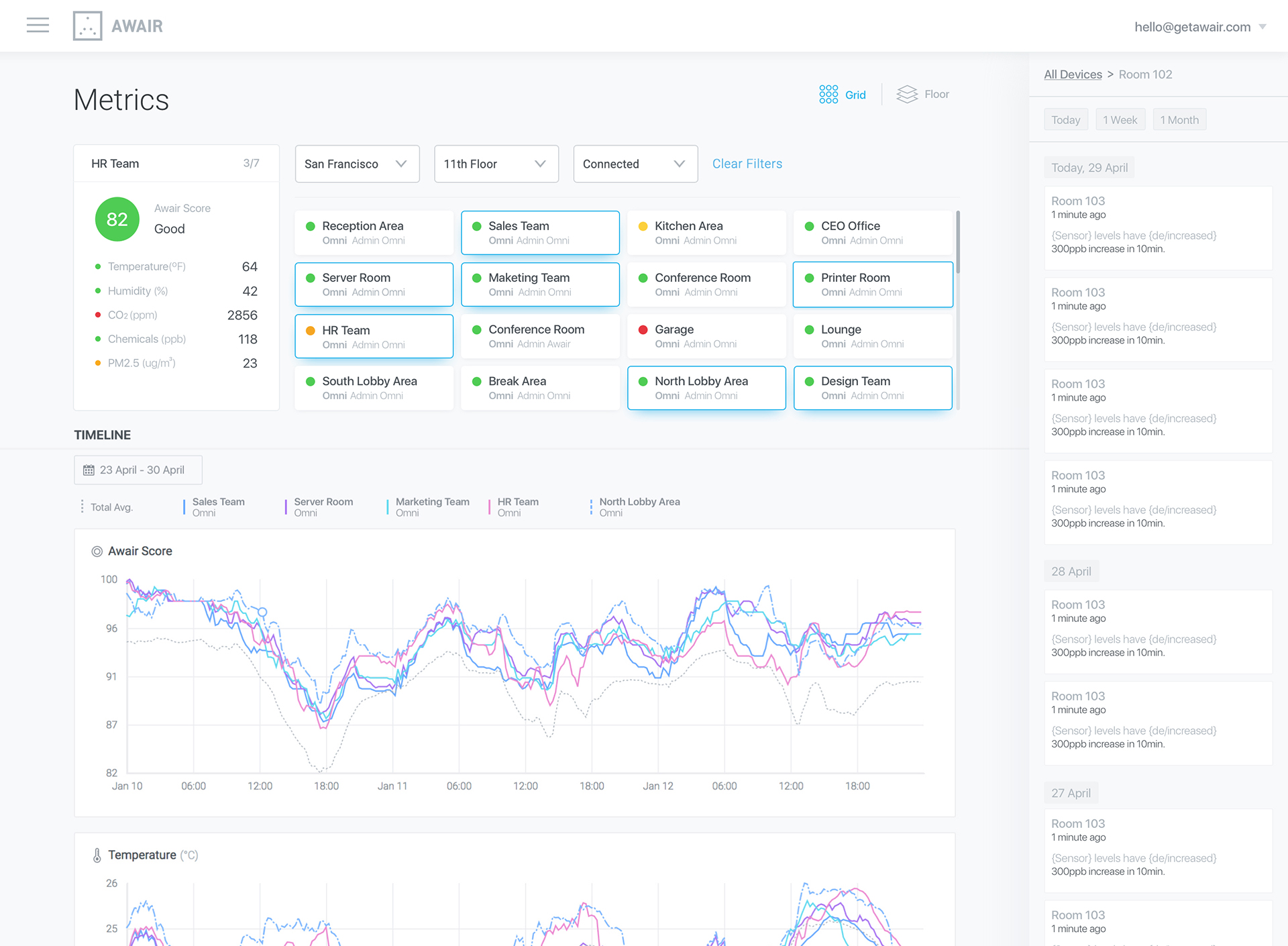 In het dashboard zijn de sensoren ook op de plattegrond zichtbaar. Zo weet je precies waar de sensoren hangen.
