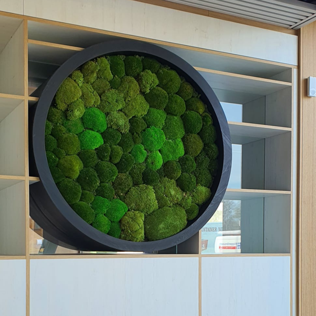 Platmos heeft een compleet andere uitstraling dan de andere twee mossoorten. Het wordt geoogst in Denemarken en Duitsland. Hierna wordt het door ons verwerkt tot een mooi mosschilderij voor op kantoor. Door onze flexibiliteit is iedere maat en vorm mogelijk. De mosschilderijen op kantoor kunnen ook op buigbaar hout worden geplaatst. Hierdoor kan zelfs een pilaar worden vergroend met een mosschilderij van Planting Power.