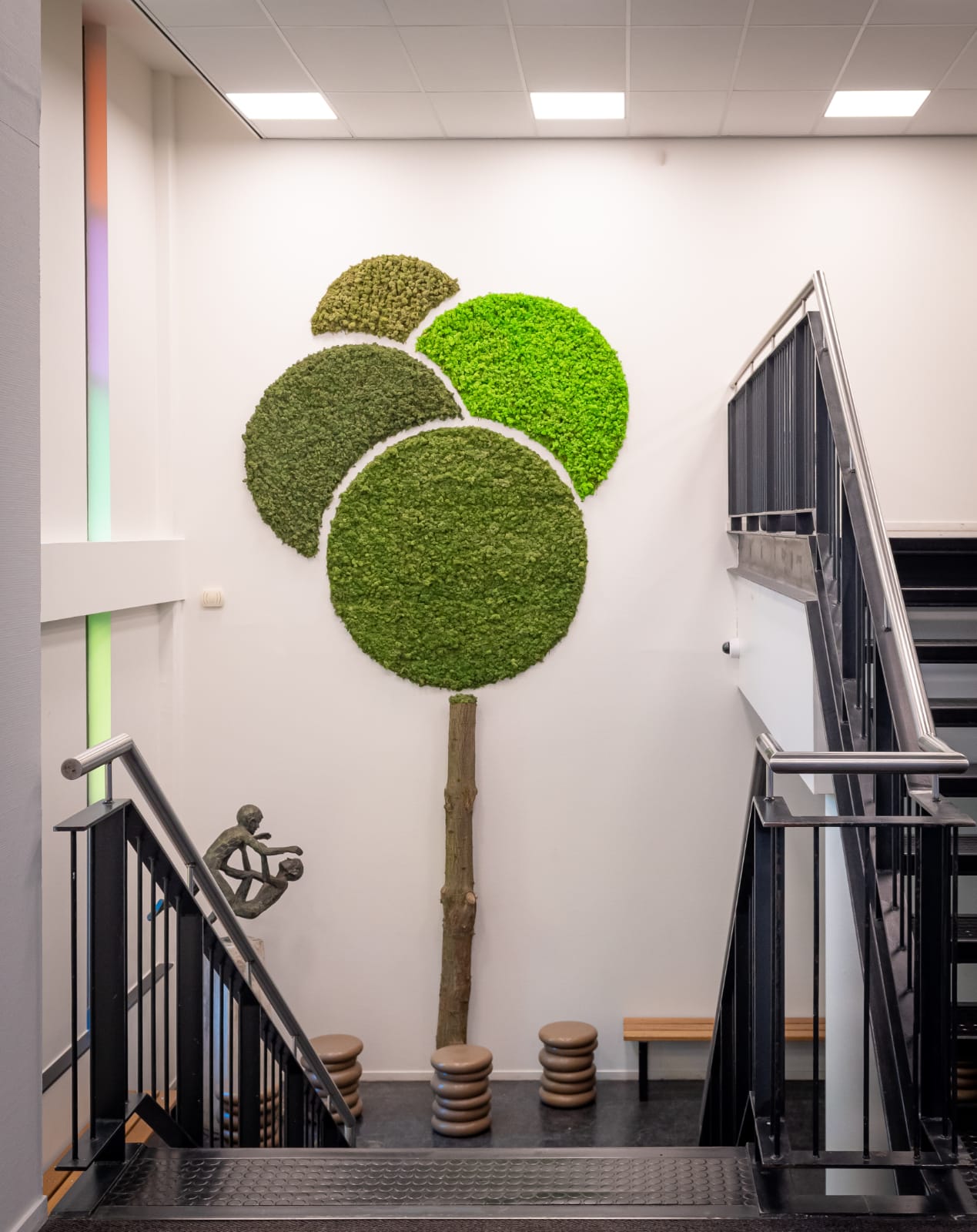 Planting Power kan ook het logo van een bedrijf verwerken in een mosschilderij op kantoor. Dit geeft een exclusieve en speciale uitstraling aan elk kantoorpand. Hiervoor wordt gebruik gemaakt van witte freesletters. Op onze inspiratie pagina staan meer voorbeelden van mosschilderijen met logo’s voor op kantoor. Een mosschilderij lijkt op verticaal groen en is een goede invulling van kantoorplanten op een klein oppervlakte.